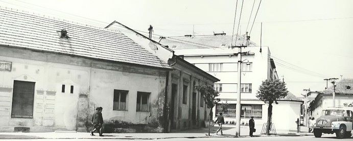 Ak by tieto budovy komunisti nezbúrali - na ich mieste dnes stojí Čapkáreň - videli by ste ich dnes z reštaurácie pod spoločenským domom aj z okien fitcentra Donald. V budove oproti kedysi fungovala opravovňa bicyklov a, ak si správne pamätám, zašívali tam aj poškodené futbalové lopty. Úzka cesta vľavo sa vtedy kľukatila smerom k námestiu. Opačným smerom by sme sa dostali k jednoposchodovej budove II. základnej školy pri vtedajšom dome osvety alebo po ceste mierne vpravo k benzínovej pumpe (dnes svetelná križovatka pri nadjazde).