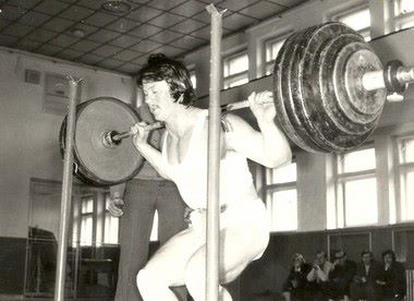 Majstrovstvá Zsl. kraja 1975 v PWL v Leviciach, Pavol Schottert vo svojej parádnej disciplíne drepe.